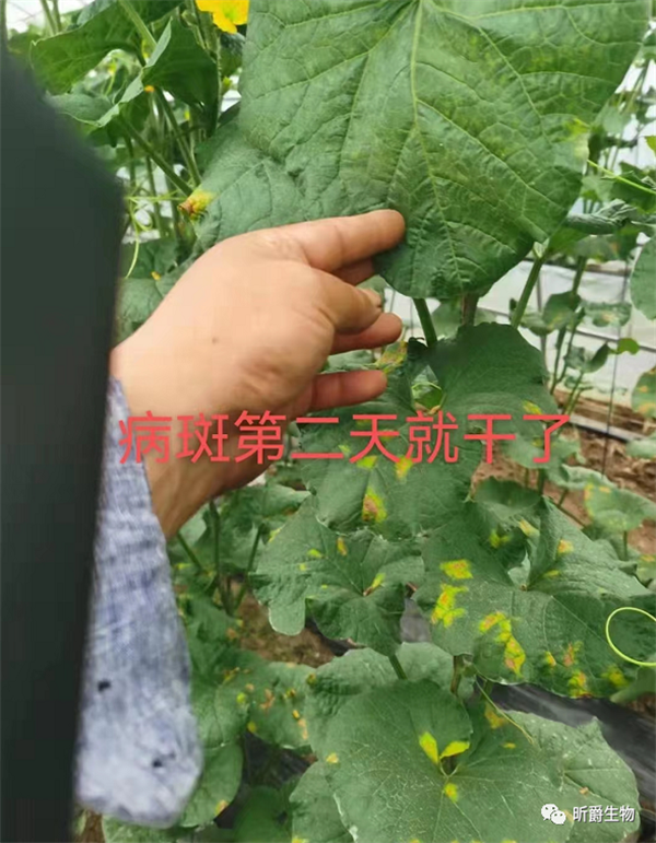 下图是江苏连云港陈大哥家自己种植的黄瓜出现了严重的霜霉病,用过逆生201后,2天病斑开始变干出现好转,