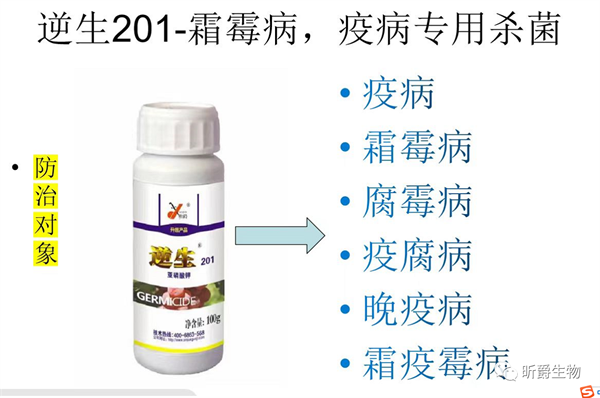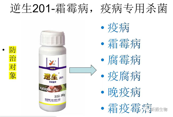 逆生201:主防治:霜霉病、霜疫霉病、晚疫病、疫(霉)病、疫腐病、腐霉病、黑胫病、猝倒病、立枯病等