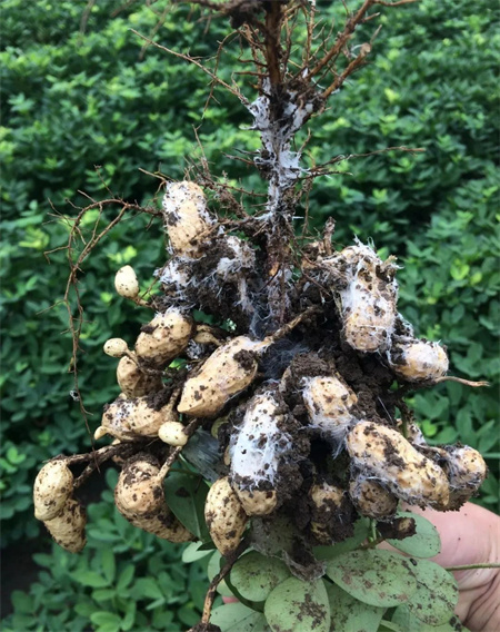 花生白绢病主要危害茎部、果柄及荚果。发病初期叶片枯黄,晴天叶片闭合,阴天尚能展开,茎基部组织呈软腐状,表皮脱落,严重的整株枯死。土壤湿度大时可见白色绢丝状菌丝覆盖病部和四周地面,后产生油菜籽状白色小菌核,后变黄土色至黑褐色。根茎部组织染病,呈纤维状,终致植株干枯而死。花生白绢病发病后减产严重,一般发病田块减产10%-20%,严重田块减产达到50%以上!