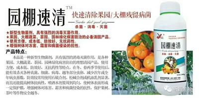 所以清棚刻不容缓对棚内附着的真菌类病源都有着较好的杀灭作用。同时,它还是诸多病害综合防治的其中一环。对病菌产生巨大杀伤力。除了病害,它还可以对根结线虫造成杀灭效果,还可对杂草上寄生的一些叶螨、蓟马、蛞蝓等虫起到抑制作用。大棚、果园清棚清园的首 选产品,昕爵园棚速清,本品是一种新型生物菌剂,具有强烈的消毒灭菌作用,是各种果园、大棚蔬菜、茶园、园林绿化病害防治的理想清园产品。使用方便,成本低、防效好,无抗药性等特点。在冬、春两季节使用后,能有效杀灭各种真菌、细菌、病毒、越冬部分虫卵,减少次年或全年病虫基数,防效较常用使用石硫合剂、松碱合剂或机油乳剂显著,而且还能提高树体抗病性,喷酒本剂要周到均匀,使树体表面形成一定保护膜,增强树体对冻害、霜害和病菌侵染的抗性,保护果树、茶叶等作物安全越冬。