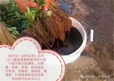 30斤水+昕爵逆生4号80克+41.7氟吡菌酰胺悬浮剂15克十肥万根30克,蘸根。对病毒,疫病,根腐,根结线虫白粉病,灰霉病,菌核病,褐腐病,叶斑病等病虫的危害持效期可达80天以上。昕爵“逆生4号”在国内已经算是销售很多年的老产品了,有着广谱、低毒、低残留、高 效力、多作用位点、真菌、细菌、病毒通管,高封闭伤口的卓越性能等优良特点。