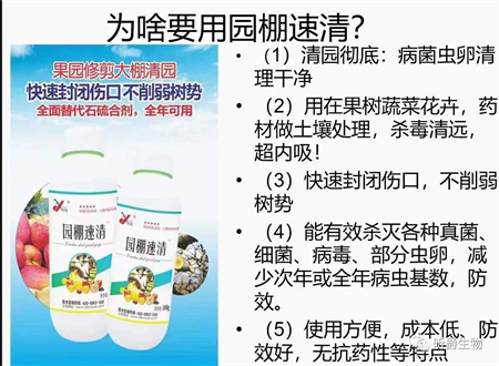 你还在用做传统的石硫合剂清园吗?那就太落后了,一瓶园棚速清帮你搞定所有的真菌细菌病毒。水溶肥厂家昕爵集团精心研制的果树高抗清园剂园棚速清集清园、消毒、杀菌、杀虫卵于一体,无化学残留,不伤害土壤微生物,保护果园生态环境。让果树在自然的怀抱中健康成长,让消费者吃得放心,让果园成为真正的绿色生态乐园。
