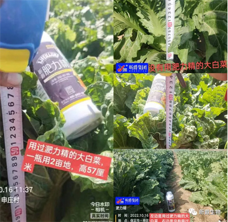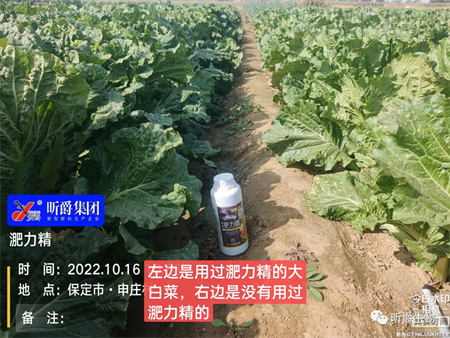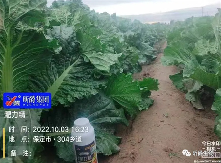 用过水溶肥厂家昕爵集团研制的叶面追肥产品淝力精的:增加白菜产量,提高了品质:促进叶片快速生长,叶片肥厚,重量增加,单棵增重20%左右,口感大幅提升,白菜耐存储,品质大大提升,是有机蔬菜和无公害蔬菜的产品。
