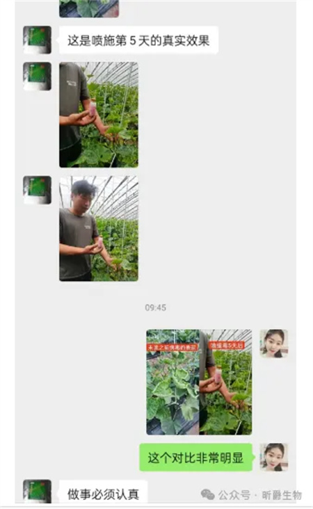 我们先一起看个市场案例。地点:河北廊坊  作物:黄瓜,当地病毒病非常厉害,在之前选择5家产品,都没治住,联系到了水溶肥厂家昕爵集团,说了当时情况,我们的业务经理听过后,给发过去4瓶样品让实验。