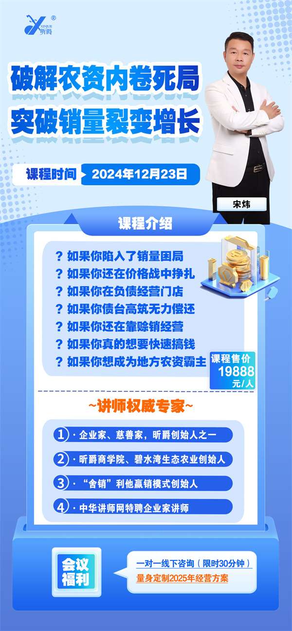 突破销量裂变增 长》专题会,由昕爵集团董事长、企业家、慈善家,昕爵集团创 始人之一——宋炜先生主讲,宋炜先生是昕爵商学院创 始人、碧水湾生态农业创 始人、中国爱农农资商会会长、“舍销”利他赢销模式创 始人、中华讲师网特聘企业家讲师、中国肥料协会理事,大量农资企业经营案例+企业实战研讨,被学员称为“行走的农资界案例库”,2025年,农资市场将进入转型期和洗牌期,本次会议将为您如何应对带来答案。