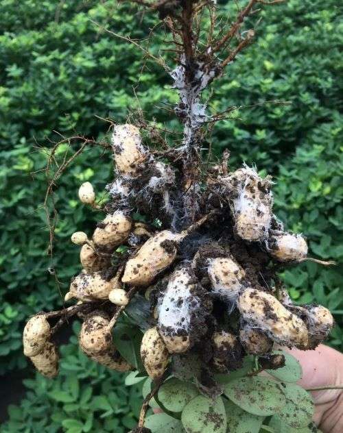 白绢病主要危害茎部、果柄及荚果。发病初期叶片枯黄,晴天叶片闭合,阴天尚能展开,茎基部组织呈软腐状,表皮脱落,严重的整株枯死。土壤湿度大时可见白色绢丝状菌丝覆盖病部和四周地面,后产生油菜籽状白色小菌核,后变黄土色至黑褐色。根茎部组织染病,呈纤维状,终致植株干枯而死。花生白绢病发病后减产严重,一般发病田块减产10%-20%,严重田块减产达到50%以上!