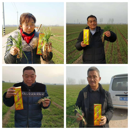 十、一播全苗:内含植物源生长刺激素,提高小麦发芽势,使小麦苗齐,苗壮,一播全苗,为后期增产奠定基础。