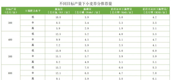 根据最新测定数据,在中等以上肥力土壤,每生产500公斤小麦籽粒需要的氮、五氧化二磷、氧化钾分别为12.15公斤、5.05公斤、12.7公斤。在减去土壤本身的养分供应量,理论上讲,能达到500公斤小麦产量所施用的肥料养分应该小于上述数据。