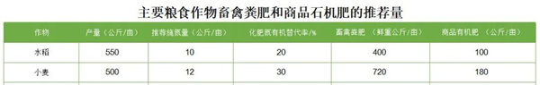 在具体施肥管理过程中,原则上由畜禽有机肥提供的氮素量不超过施氮量的30%。以下为主要粮食作物畜禽粪肥和商品有机肥的推荐用量。